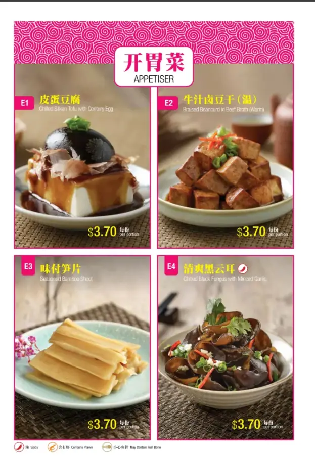 | Chilled Silken Tofu with Century Egg | SGD 3.70 |