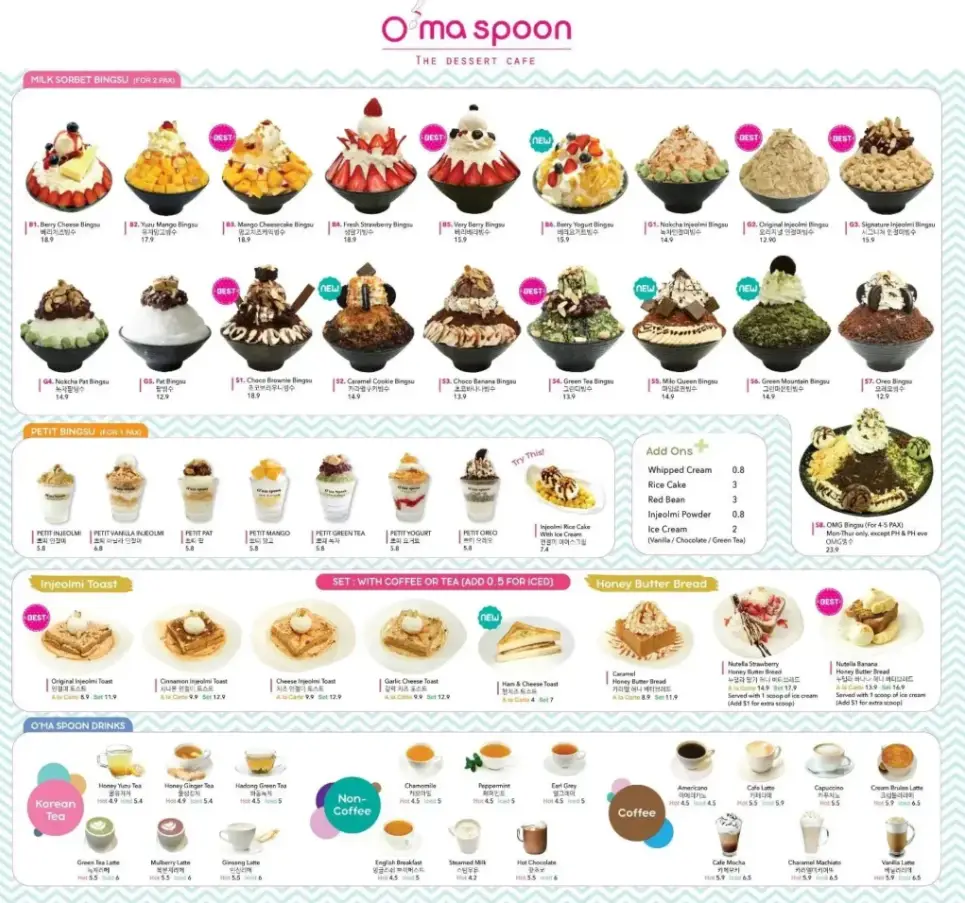 O’ma Spoon Menu Singapore has been neatly arranged into various other categories that include Bingsu, Coffee, Korean Tea, Herbal Tea & Others, Toasts, Fizzy Ade, and Milk-Based.