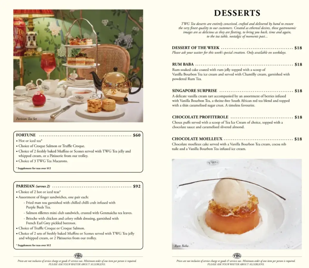 Check out below to find all updated menu prices of TWG Tea Restaurant: