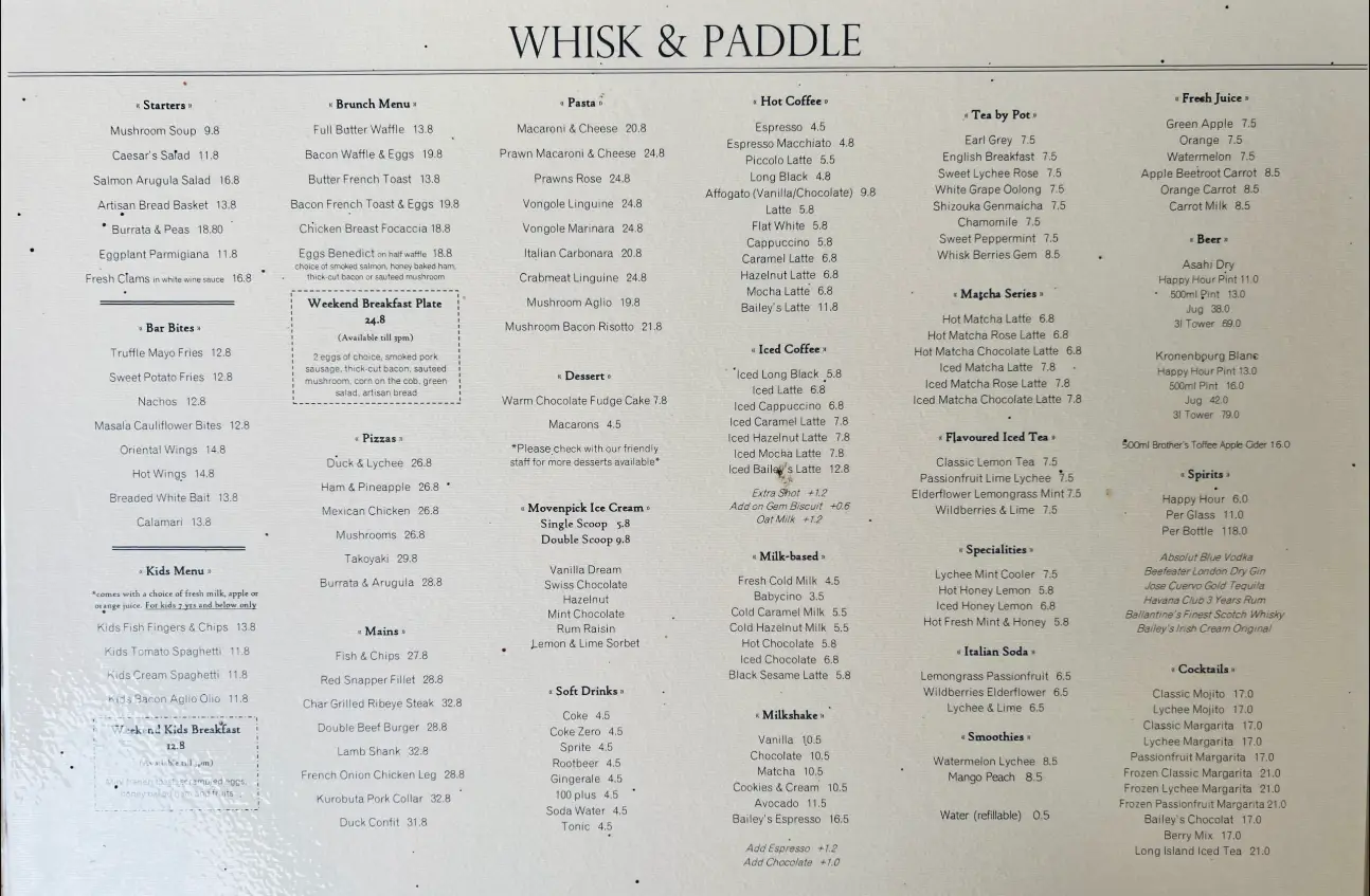 WHISK & PADDLE SINGAPORE MENU PRICES 2025